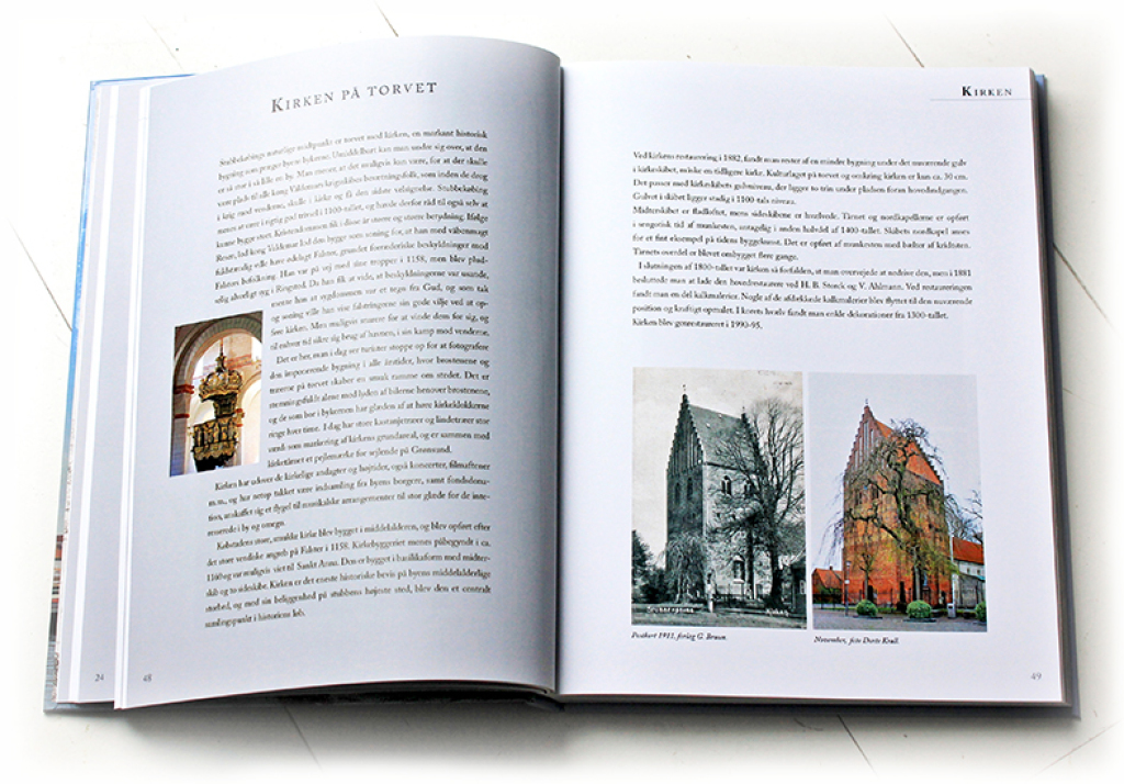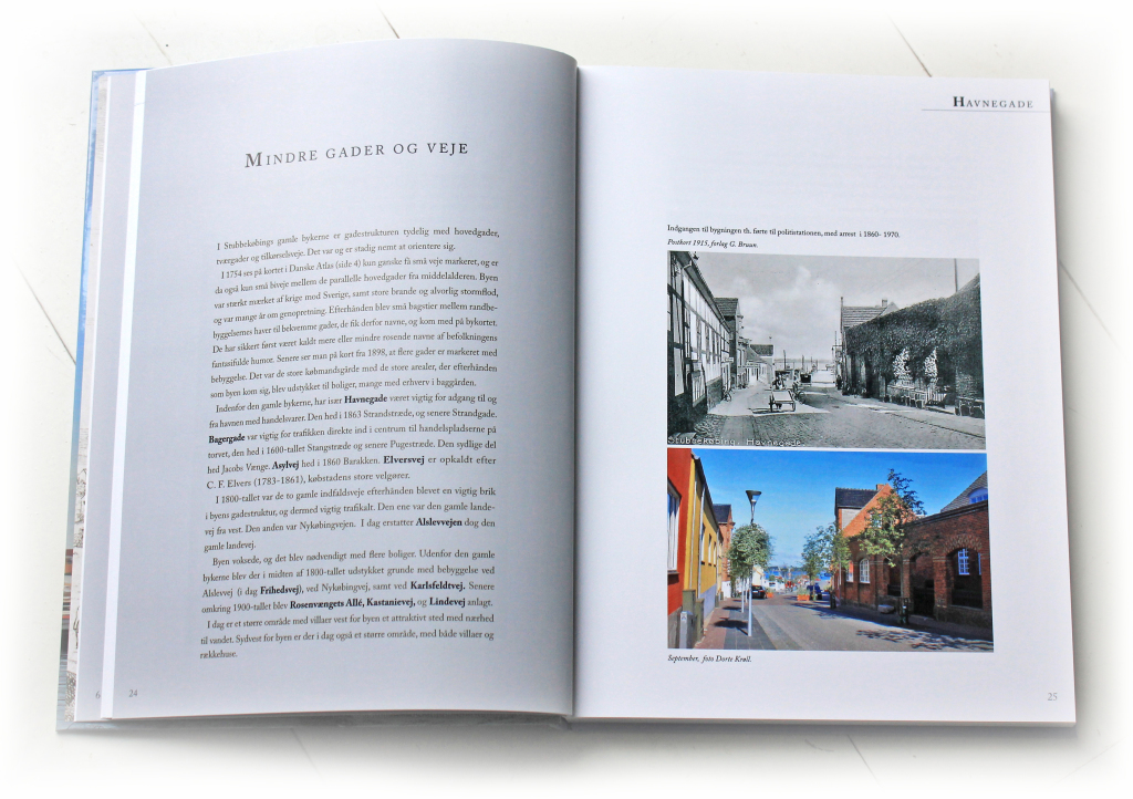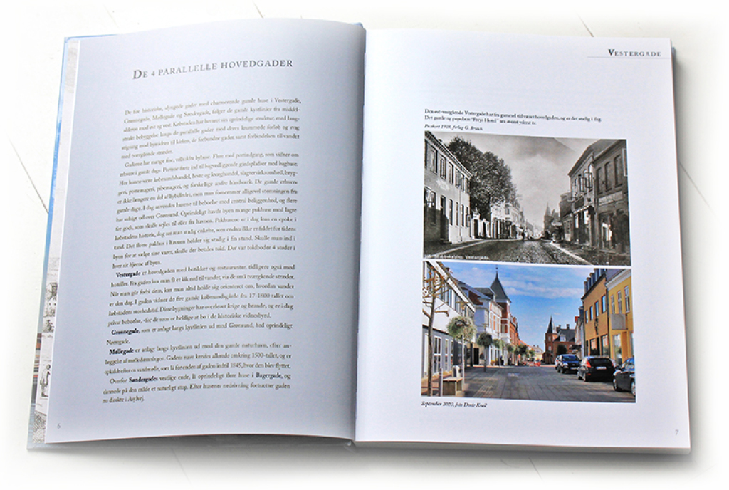 Bogen indeholder både historiske fotos, og især mange flotte helt nye fotos fra byen. Man kan læse sideløbende om byens historiske udvikling, og om forskellige bygninger og steder i forbindelse med billederne.